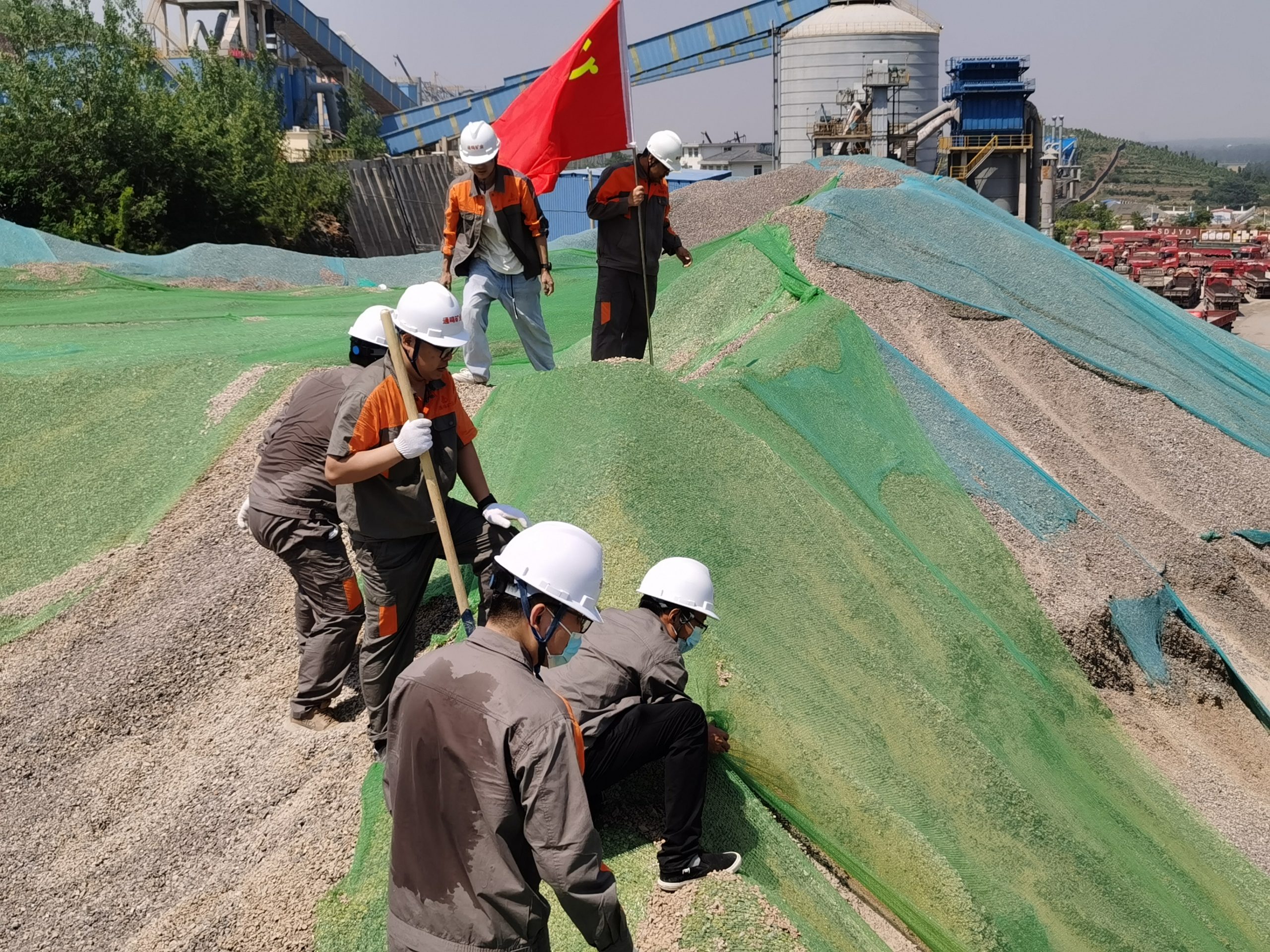 一個支部就是一座堡壘,一名黨員就是一面旗幟,行動是最有力的帶動,示范是最鮮明的垂范。為牢固樹立綠色礦山發(fā)展理念,堅決貫徹落實“綠水青山就是金山銀山”政策,2023年6月8日上午,通鳴黨支部組織黨員同志到汽修房處對裸露在外的石料進行防塵網(wǎng)的覆蓋,黨員同志們冒著酷暑,不畏炎熱,沖鋒在前,經(jīng)過一上午的努力,最終克服困難順利完成任務(wù)。通鳴黨支部著力發(fā)展基層黨組組織的戰(zhàn)斗堡壘作用和黨員的先鋒模范作用,通鳴黨支部始終堅守初心、擔當使命,敬業(yè)愛崗,用自己的實際行動讓黨旗飄揚在最高處。