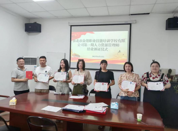 2023年6月13日,勞代公司淮北市眾幫職業(yè)技能培訓(xùn)學(xué)校為第一期38名學(xué)員頒發(fā)了企業(yè)人力資源管理師證書(shū),通過(guò)率達(dá)99%。我校利用周末時(shí)間以線上+線下結(jié)合的教學(xué)模式開(kāi)展企業(yè)人力資源管理師培訓(xùn),培訓(xùn)教師通過(guò)舉實(shí)例、現(xiàn)場(chǎng)提問(wèn)、模擬現(xiàn)實(shí)場(chǎng)景的方法,宣講了從事企業(yè)人力資源管理工作的方法和經(jīng)驗(yàn),進(jìn)一步提升了培訓(xùn)學(xué)員的工作能力,規(guī)范了學(xué)員在從事企業(yè)人力資源管理工作中的操作方法和工作流程。形成“培訓(xùn)—技能提高—企業(yè)發(fā)展—再培訓(xùn)”的發(fā)展模式,讓學(xué)員真正做到學(xué)以致用。