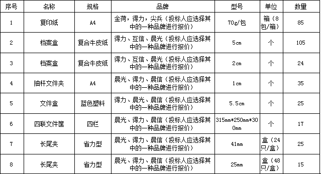 | 招標(biāo)范圍 | 包括但不限于辦公用品的生產(chǎn)供貨、包裝、運輸、檢測、驗收、質(zhì)保及售后服務(wù)等。如有漏項或缺項,投標(biāo)人承擔(dān)全部責(zé)任。 | |||||||||