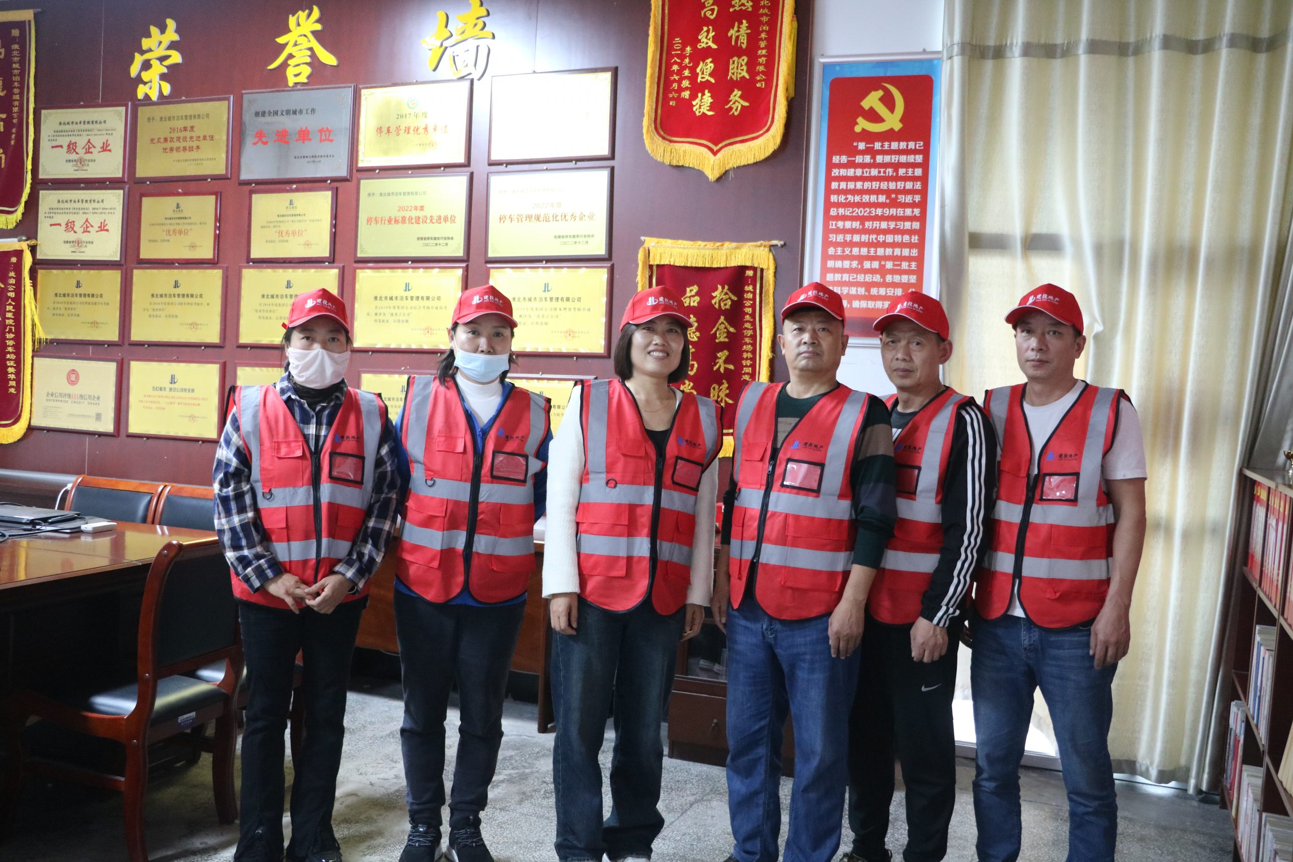 新工作服馬甲、帽子以中國紅為主色調(diào),中間相間銀色反光條,形成極大的顏色反差效果,具有更加醒目的視覺效果,增強(qiáng)了收費(fèi)員晚間或惡劣天氣工作條件下的安全性。同時(shí),衣服的背面印有公司的logo及“淮北城泊”的字樣,辨識(shí)度更高,能夠進(jìn)一步展現(xiàn)停車收費(fèi)服務(wù)的良好形象,方便更好的開展停車管理及收費(fèi)工作。