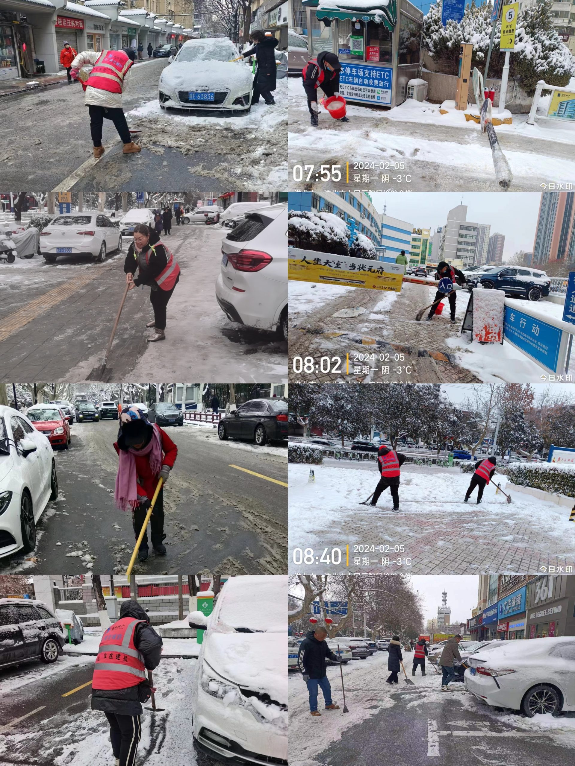 工作人員帶著鐵鍬雪鏟,充分發(fā)揮黨員模范帶頭作用,不畏嚴寒、沖鋒在前,積極參與除雪融冰、道路清潔。每個人分區(qū)清掃停車場出入口和路面人行道上的積雪,針對已經(jīng)結(jié)冰的路面,工作人員使用除冰劑進行清除。大家齊心協(xié)力,為停車場及路面車道車輛出入開辟了一條安全暢通路。