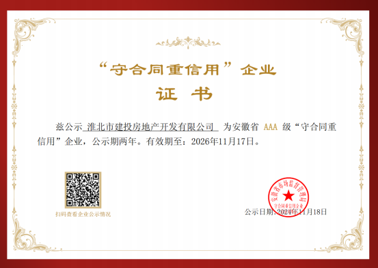 11月18日,省市場(chǎng)管理監(jiān)督局發(fā)布了2022-2023年安徽省AAA級(jí)“守合同重信用”企業(yè)信用等級(jí)評(píng)定結(jié)果,淮北市建投房地產(chǎn)開(kāi)發(fā)有限公司憑借良好的綜合實(shí)力和市場(chǎng)滿(mǎn)意度、信譽(yù)度,獲評(píng)“AAA”級(jí)守合同重信用企業(yè)稱(chēng)號(hào),成為全省618家“AAA”級(jí)信用企業(yè)之一。
