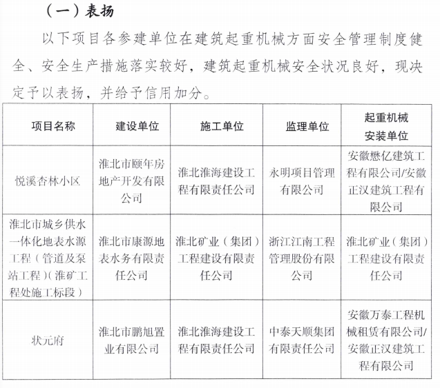 2025年7月21日,淮北市建筑工程管理處發(fā)布了2025年建筑起重機(jī)械安全專項(xiàng)檢查情況通報(bào),淮海建工公司承建的悅溪杏林小區(qū)、狀元府兩個(gè)項(xiàng)目在安全管理制度健全、安全生產(chǎn)措施落實(shí)及建筑起重機(jī)械安全狀況良好等方面表現(xiàn)突出,獲得市建管處通報(bào)表?yè)P(yáng)的同時(shí)也為公司贏得了信用加分!