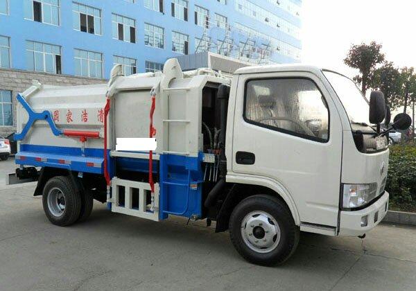 b.車上配置:有效裝載容積5立方,箱體采用邊三底四碳鋼板制作,箱體前部側(cè)面帶有掛桶提升機(jī)構(gòu),可自動舉升垃圾桶倒入垃圾,帶自卸功能,尾部裝有橡膠密封條,防污水滴漏。